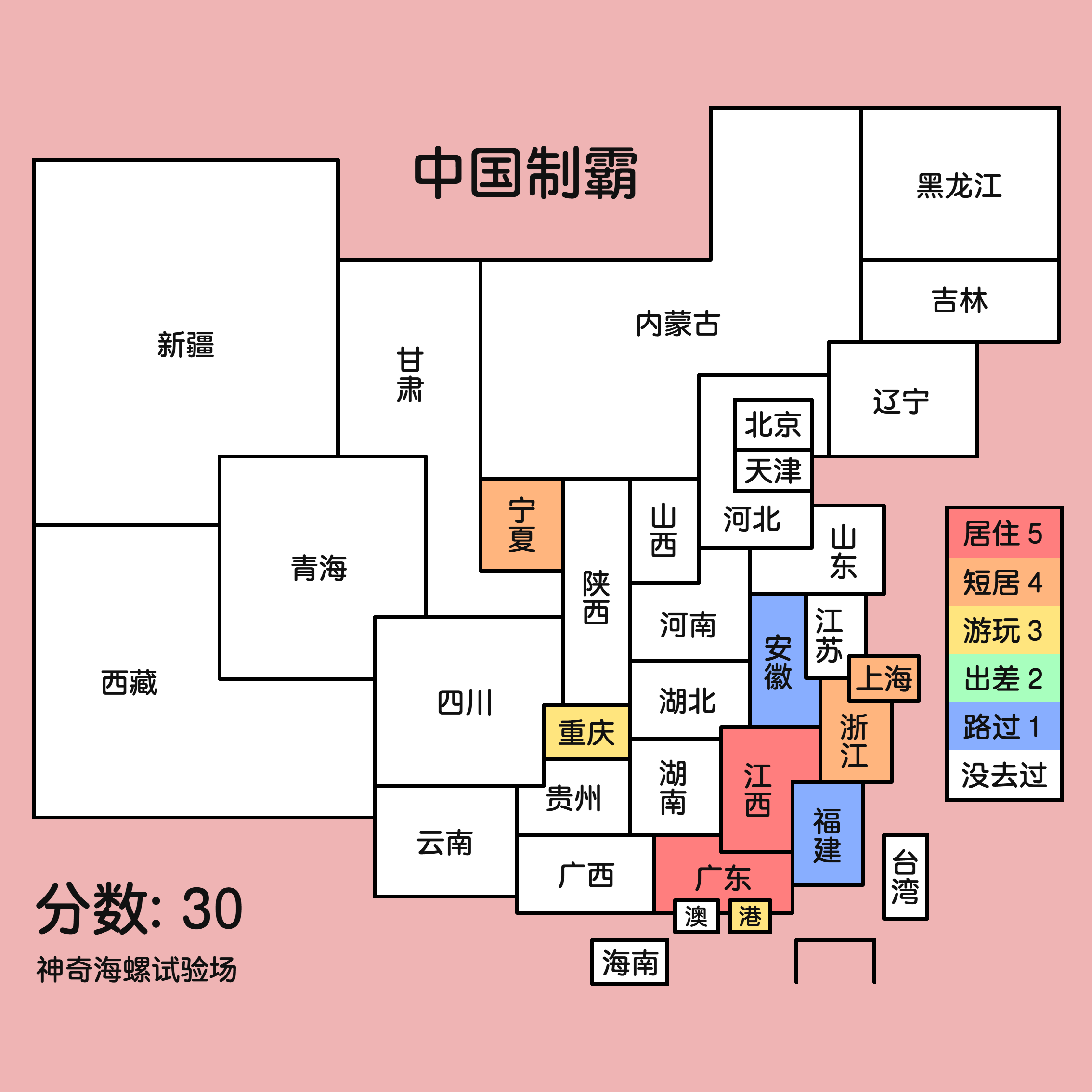 推荐一个叫 「中国制霸生成器」 的开源小游戏。你可以在简化的中国地图上用不同颜色标记居住、游玩、去过的地方,然后生成一张图片。