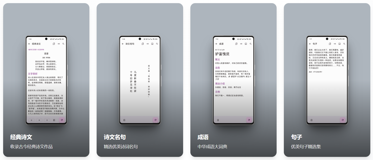 它不追求花哨的功能,而是将诗词、成语、汉字与传统文化内容系统化整合,用最简洁的方式呈现最丰富的文化积累。无广告、无需注册、支持离线使用,让阅读与学习回归本身。