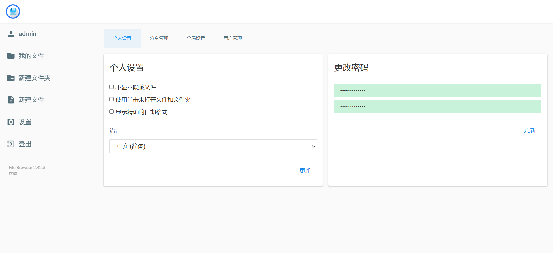 • 数据库文件:首次运行会自动生成 filebrowser.db(保存账号密码等信息)。
