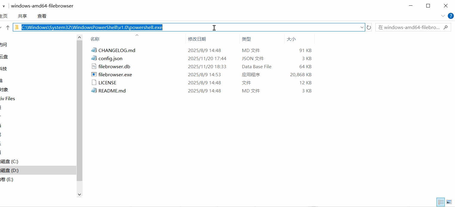 1. filebrowser.exe 所在目录打开 PowerShell(资源管理器地址栏输入 powershell)。