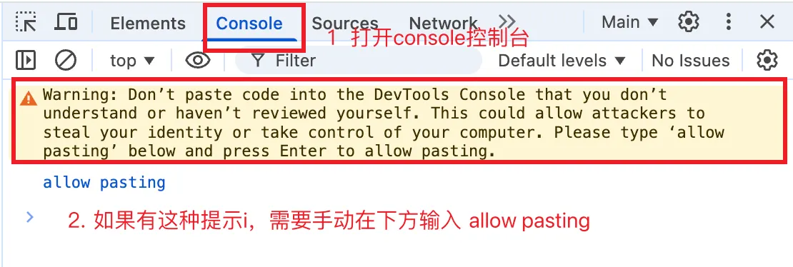 第一次使用,需要输入 allow pasting 指令,允许在 console 进行粘贴
