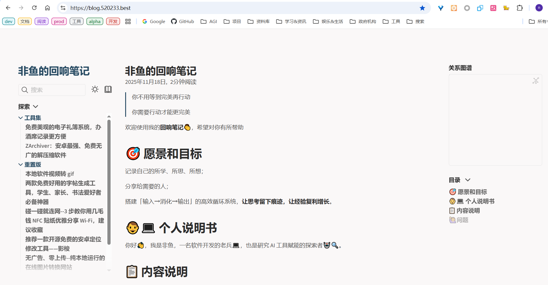 • 内置 SEO 与 PWA 支持,几乎开箱即用。 实验下来发现页面简洁美观,手机端适配也还行。这点相对于飞书云文档好多了,我决定弃用飞书云文档,以后直接在obstain里写内容,然后直接发布到网站。 效果如下: 网站地址:https://blog.520233.best/