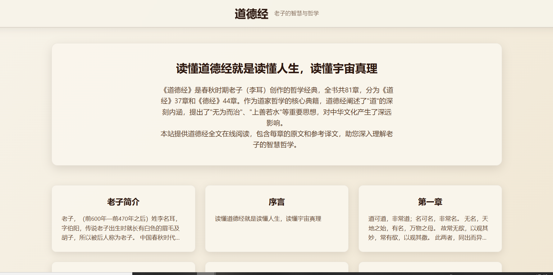 最近发现一个很不错的《道德经》阅读网站,分享给同样喜欢传统文化的朋友们: 👉 https://daodejing.shop/